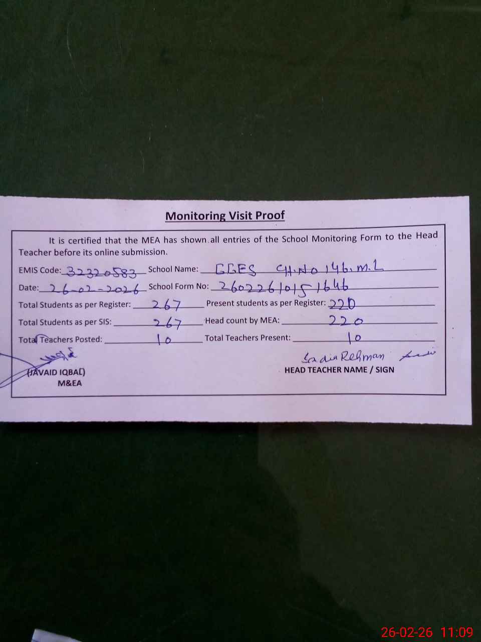| EMIS Code: 32320583 | Name of School: GGES CHAK NO. 146 ML | |||