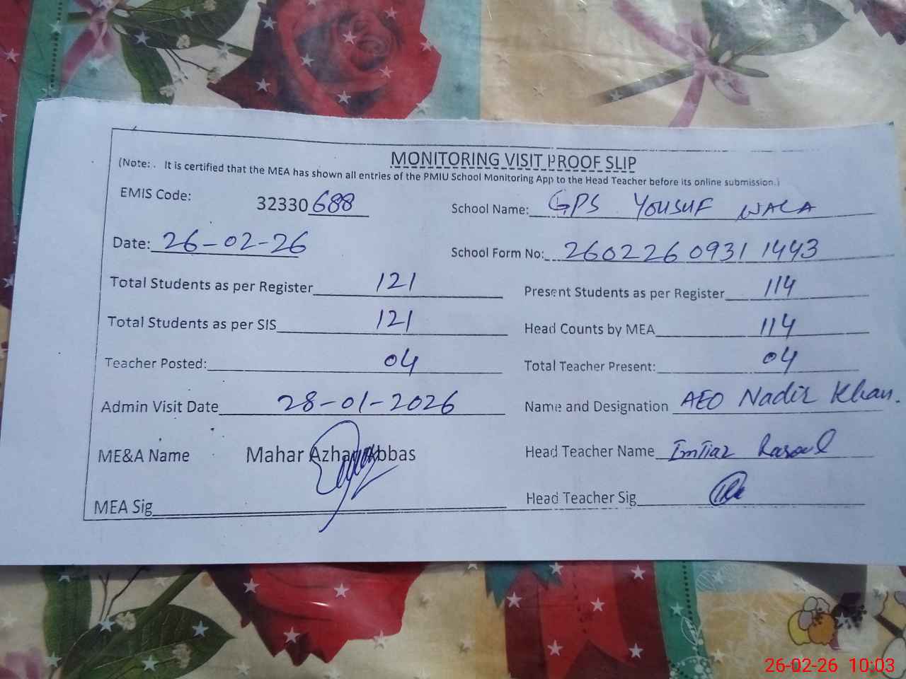 | Attendance Register | Head Teacher | MEA with School | Visit Proof |