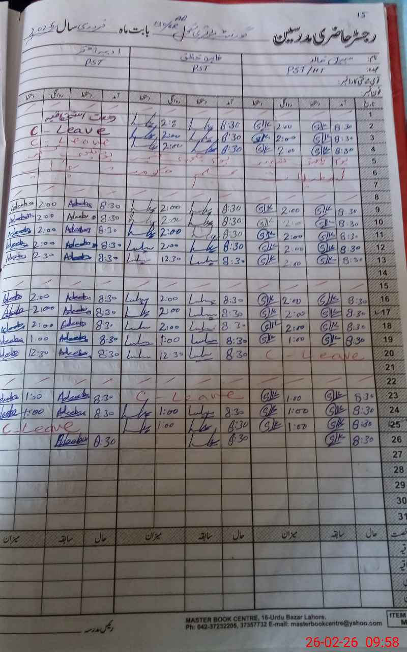 | CNIC | Full Name | Designation | R/C | Absence During Last Calender Month |