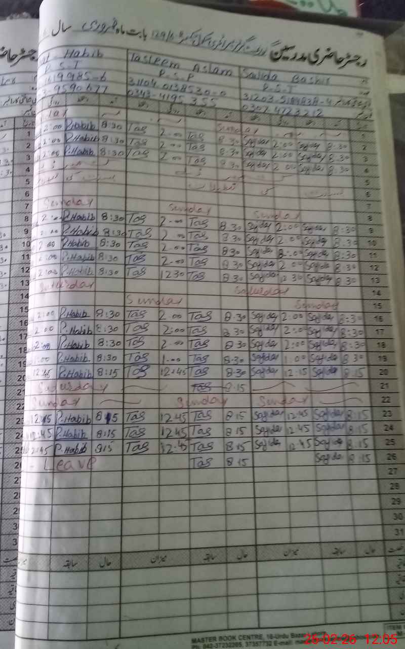 | CNIC | Full Name | Designation | R/C | Absence During Last Calender Month |