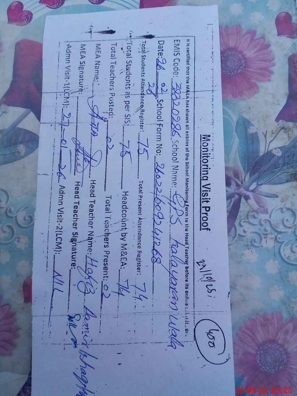 | Attendance Register | Head Teacher | MEA with School | Visit Proof |