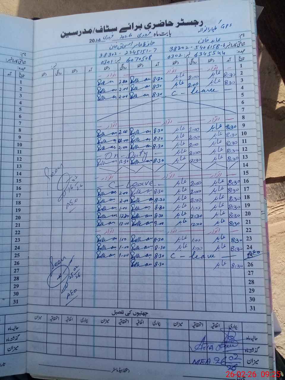 | CNIC | Full Name | Designation | R/C | Absence During Last Calender Month |