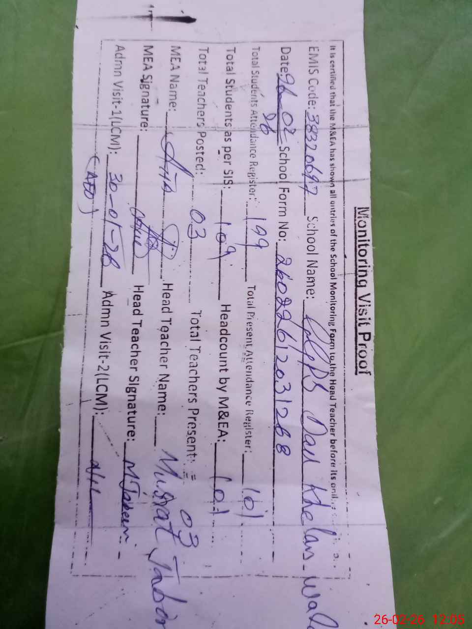 | Attendance Register | Head Teacher | MEA with School | Visit Proof |