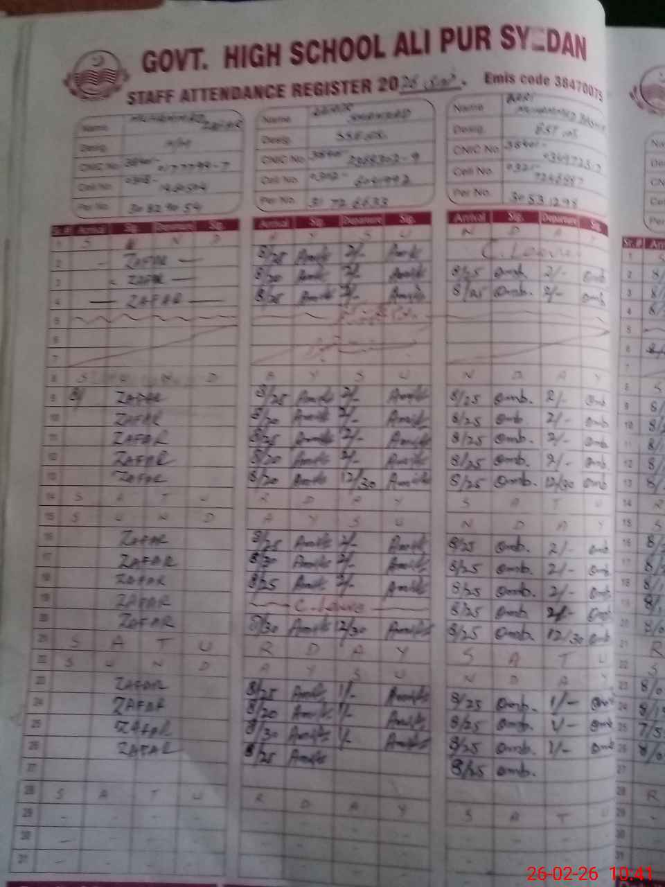 | CNIC | Full Name | Designation | R/C | Absence during last cal. month |