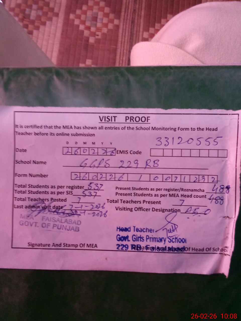 | EMIS Code: 33120555 | Name of School: GGPS CHAK 229 RB MAKUANA KHURRIANWALA | |||