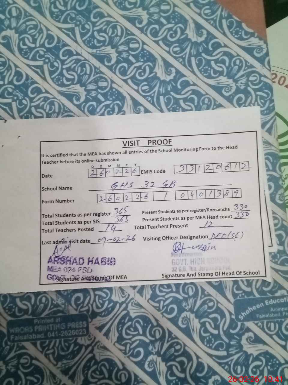 | Certified that this School was Inspected by the Undersigned MEA/DMO Today and the Information Stated Above is as Per Record. | |||||