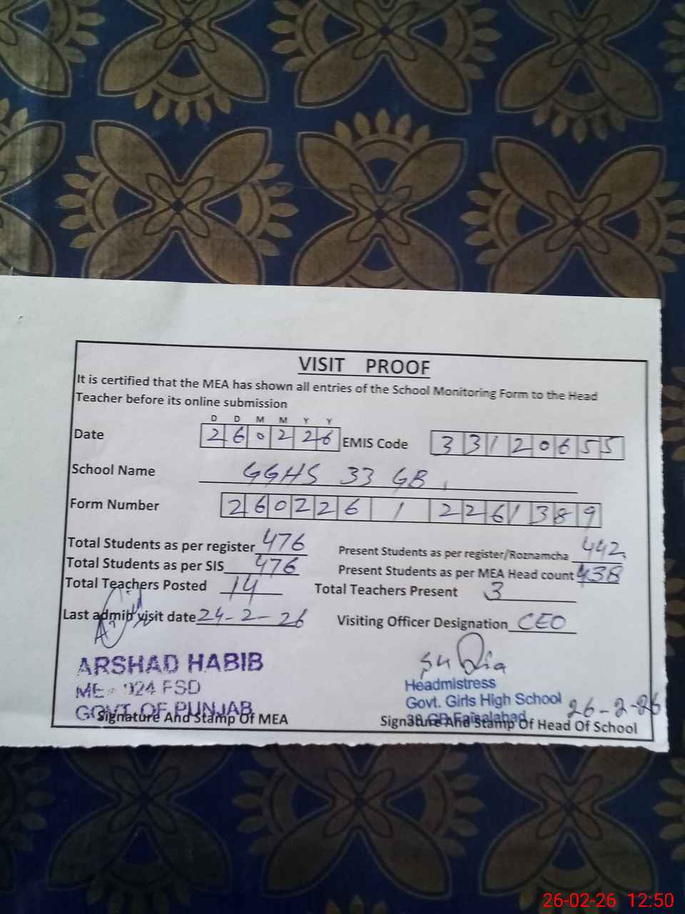 | Certified that this School was Inspected by the Undersigned MEA/DMO Today and the Information Stated Above is as Per Record. | |||||