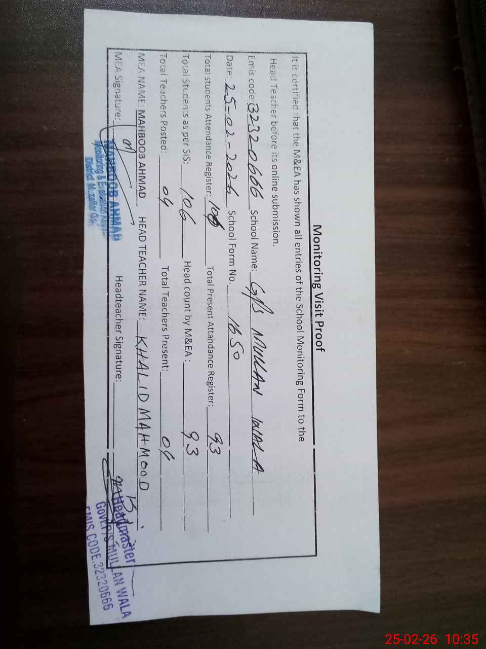 | EMIS Code: 32320666 | Name of School: GPS MULLAN WALA | |||