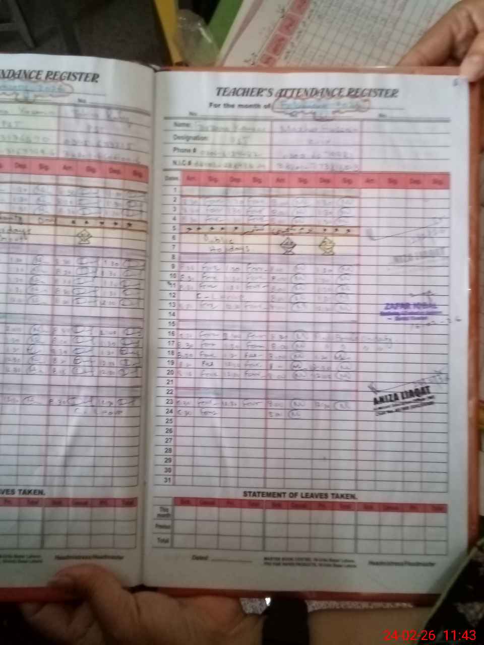 | CNIC | Full Name | Designation | R/C | Absence During Last Calender Month |