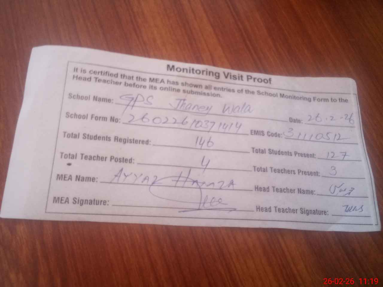 | Attendance Register | Head Teacher | MEA with School | Visit Proof |