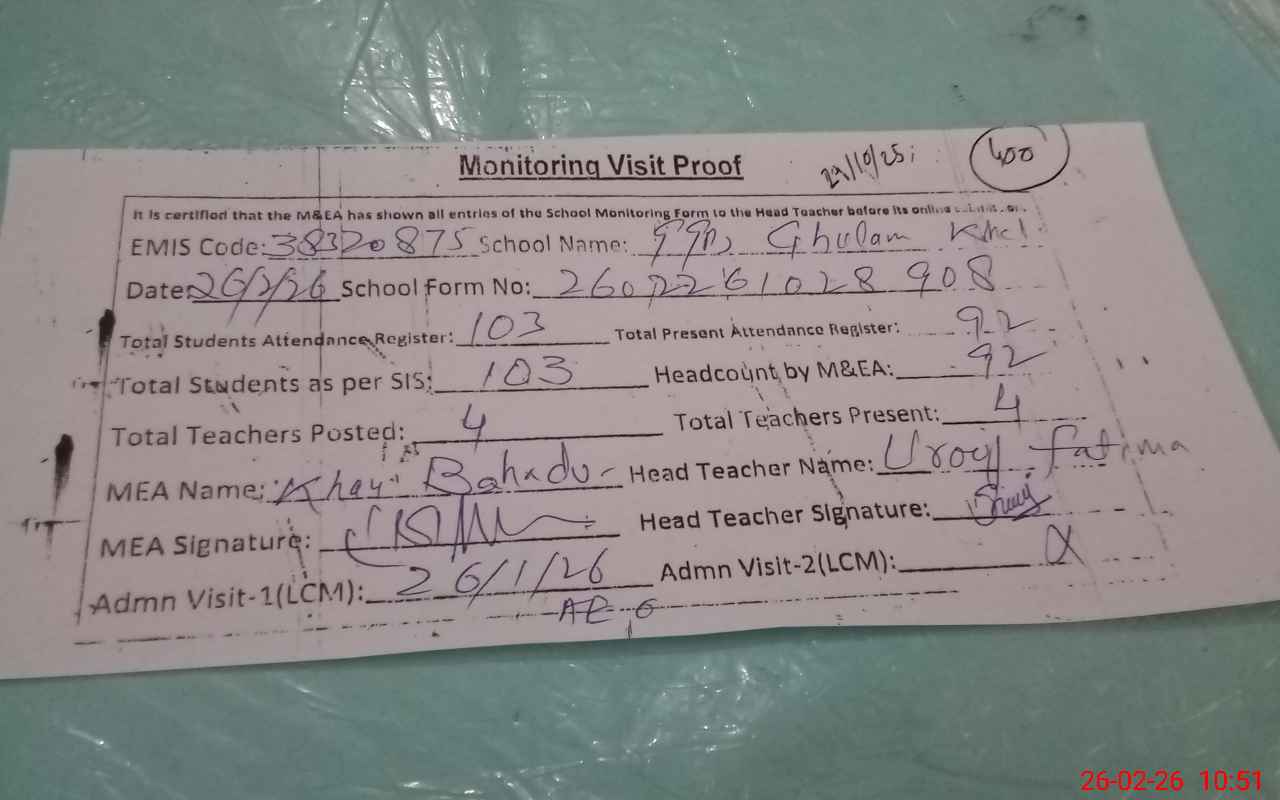 | EMIS Code: 38320875 | Name of School: GGPS GHULAM KHEL | |||
