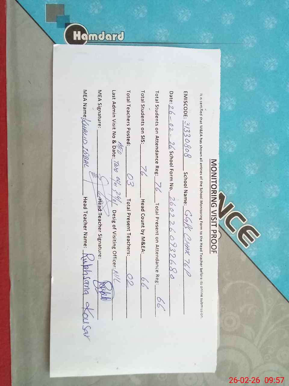 | Attendance Register | Head Teacher | MEA with School | Visit Proof |