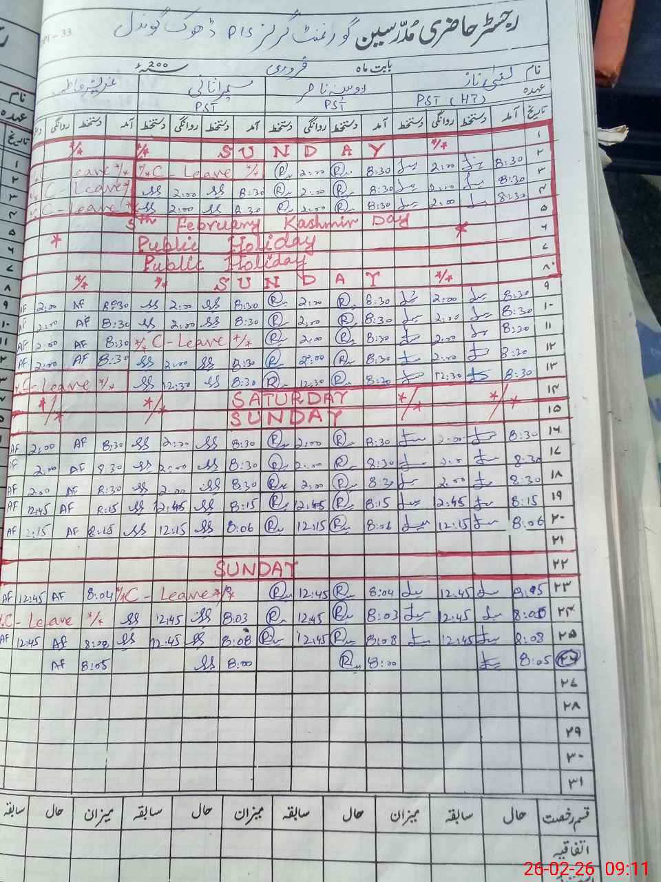| CNIC | Full Name | Designation | R/C | Absence During Last Calender Month |