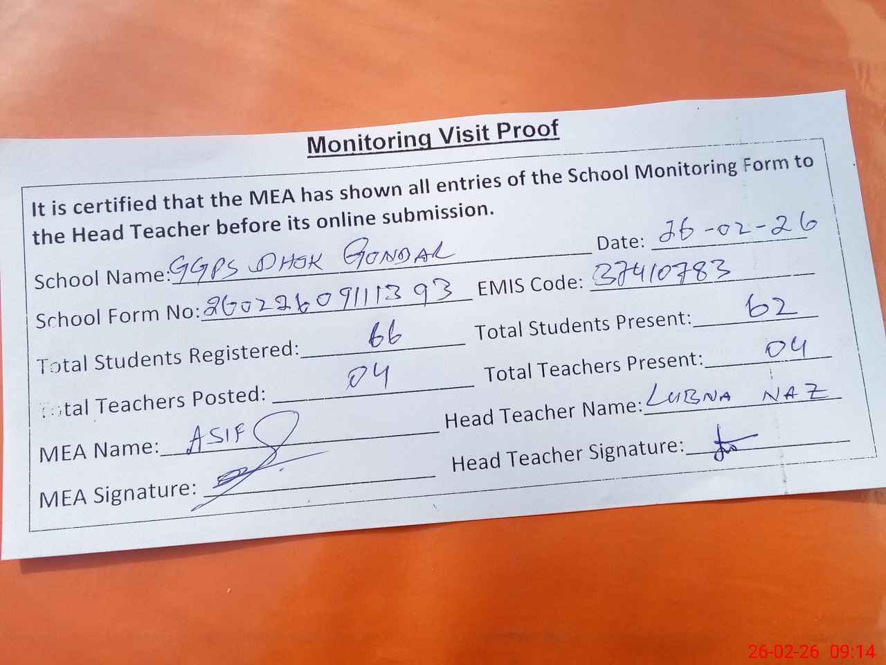 | Attendance Register | Head Teacher | MEA with School | Visit Proof |