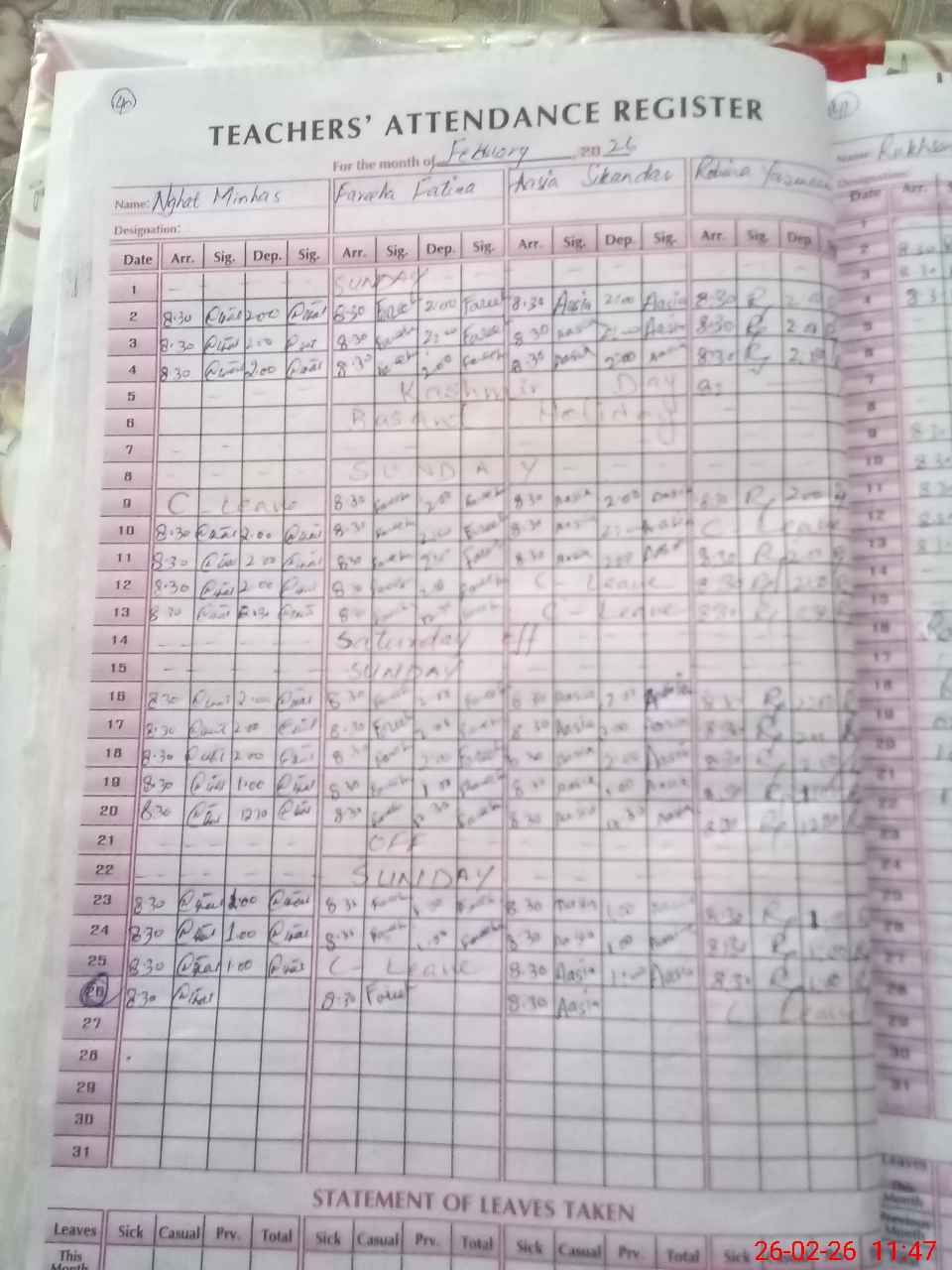 | Leave | Duty | Absent | Maternity | Medical | Ex- Pak |