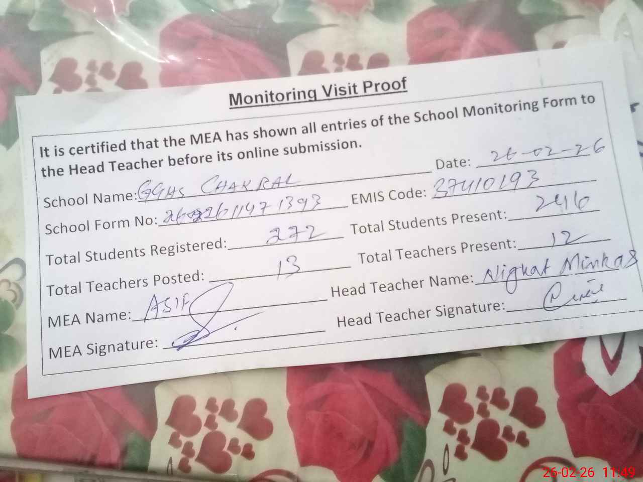 | Attendance Register | Head Teacher | MEA with School | Visit Proof |