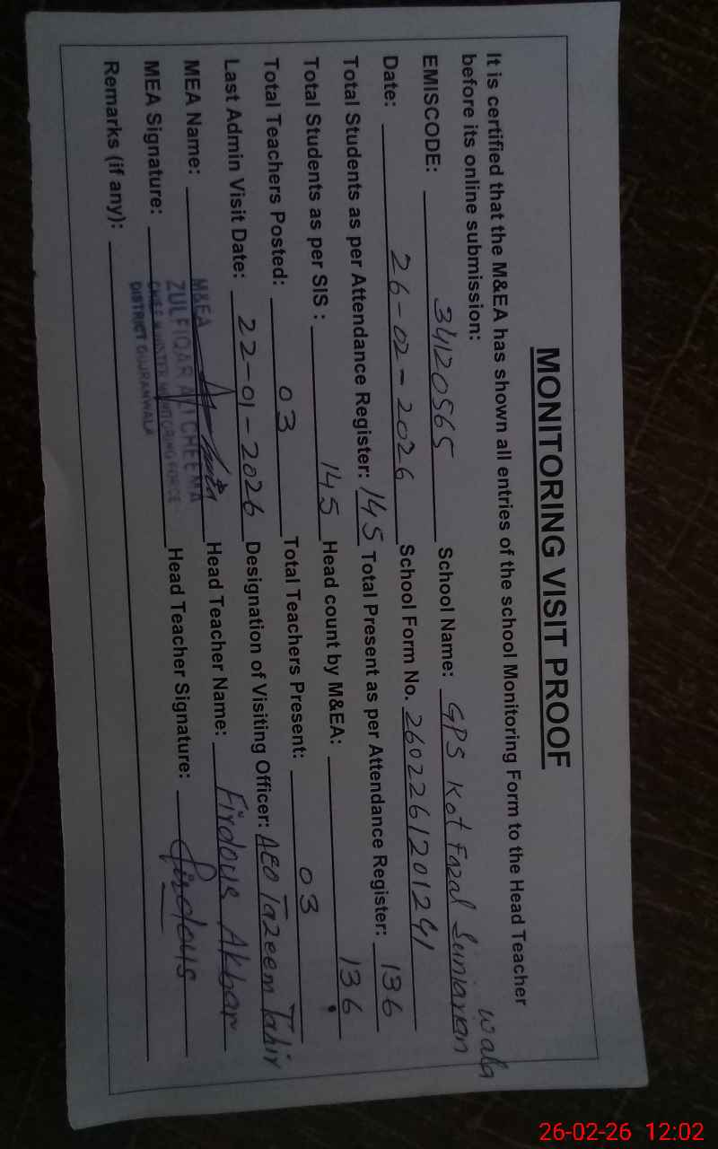 | EMIS Code: 34120565 | Name of School: GPS KOT FAZAL (SUNIARIAN WALA) | |||