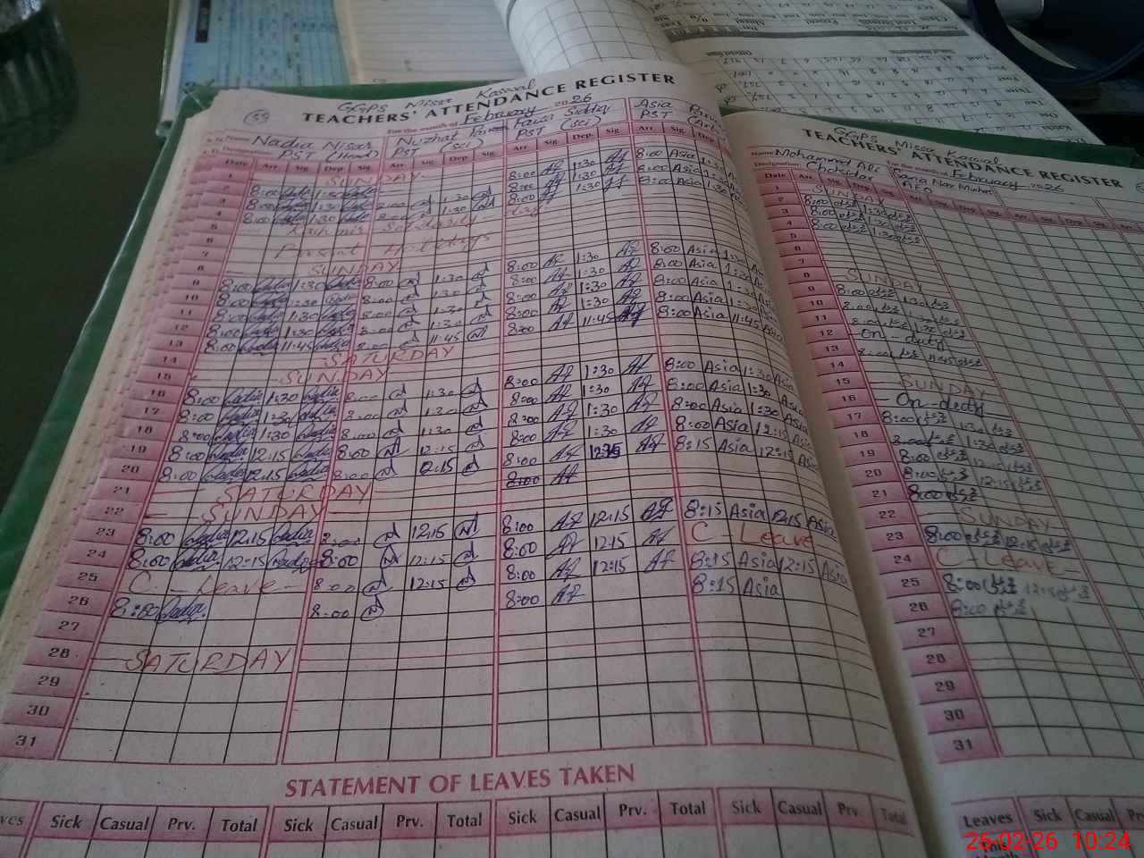 | Leave | Duty | Absent | Maternity | Medical | Ex- Pak |