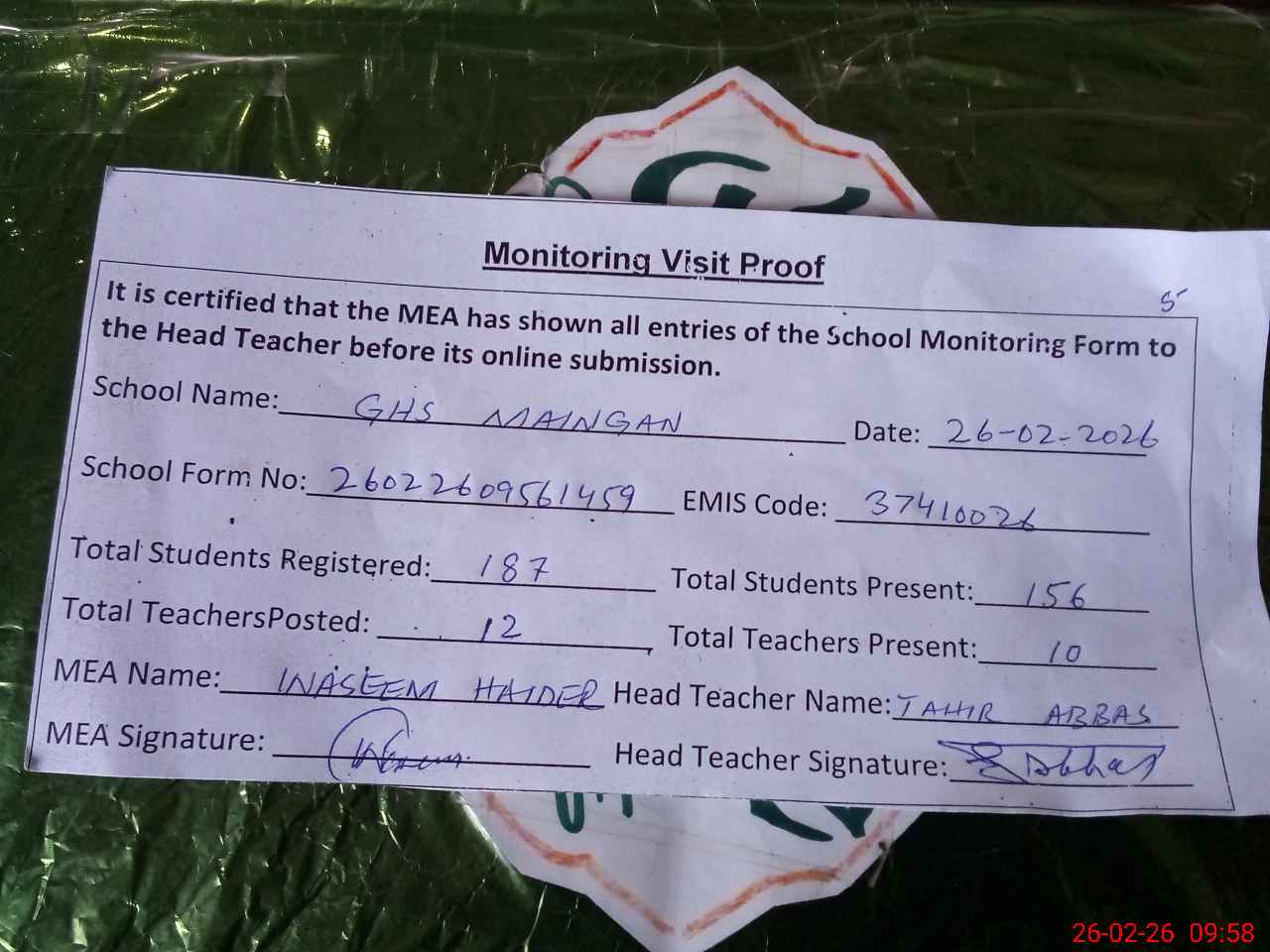 | EMIS Code: 37410026 | Name of School: GHS MAINGAN CHAKWAL | |||