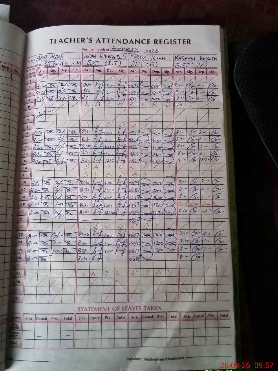 | Remarks (Use Separate Page if Required): Pst Raeesa was marked on leave but no approved leave record was available in school so I marked her unauthorized | |||||