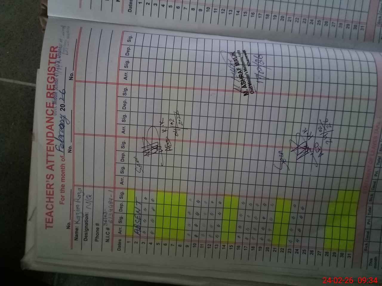 | CNIC | Full Name | Designation | R/C | Absence during last cal. month |