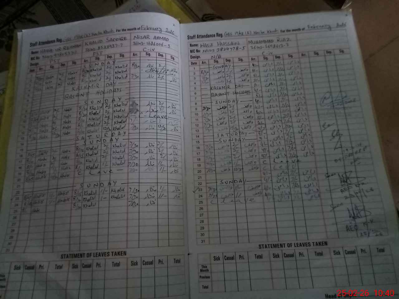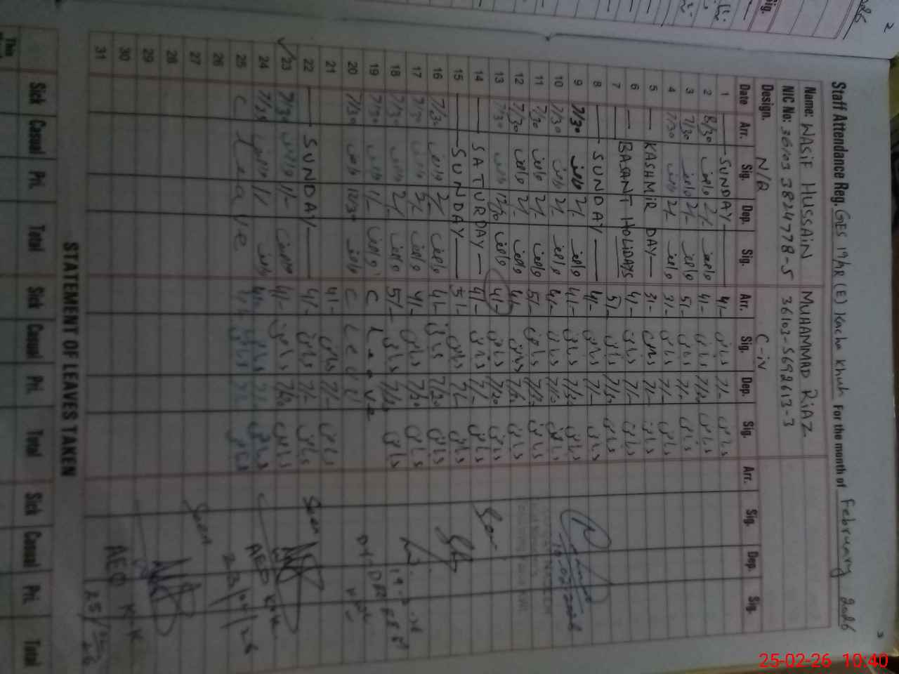| CNIC | Full Name | Designation | R/C | Absence During Last Calender Month |