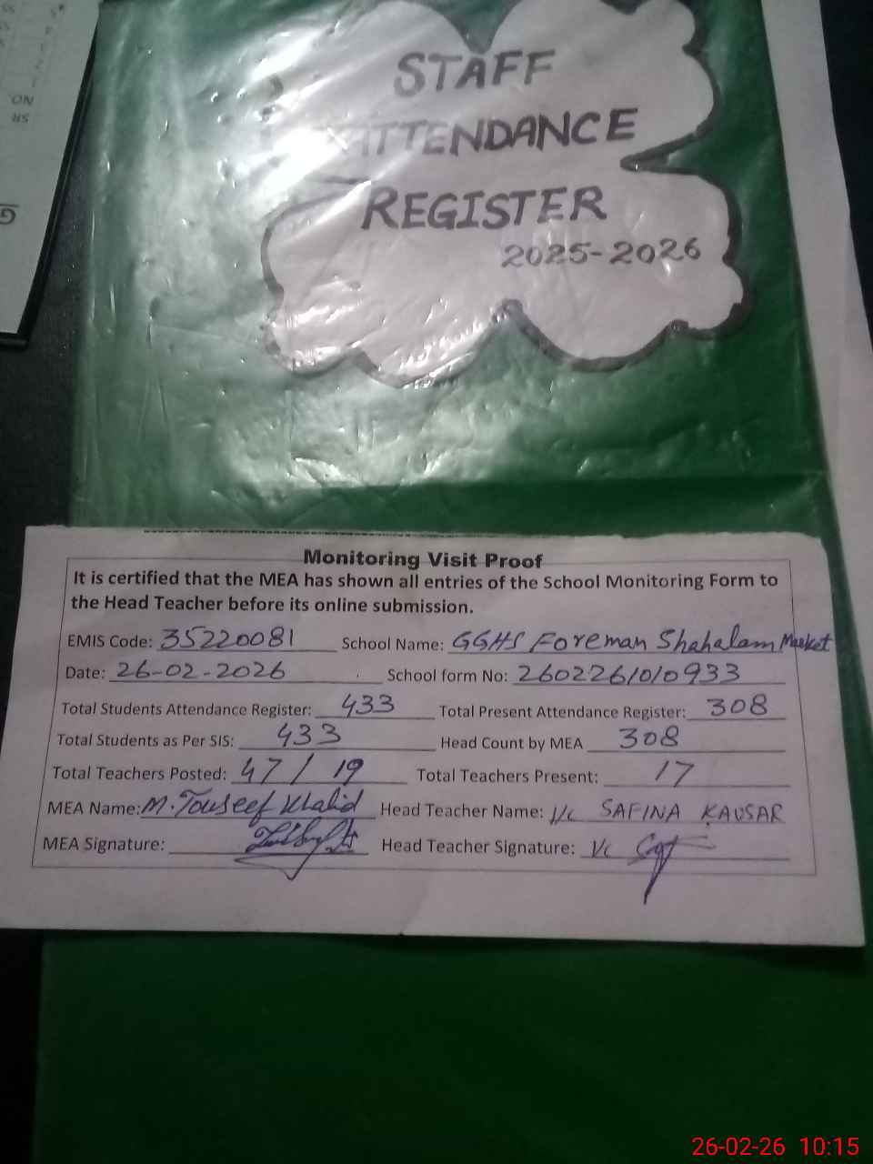 | EMIS Code: 35220081 | Name of School: GGHS FOREMAN SHAHALAM MARKET | |||