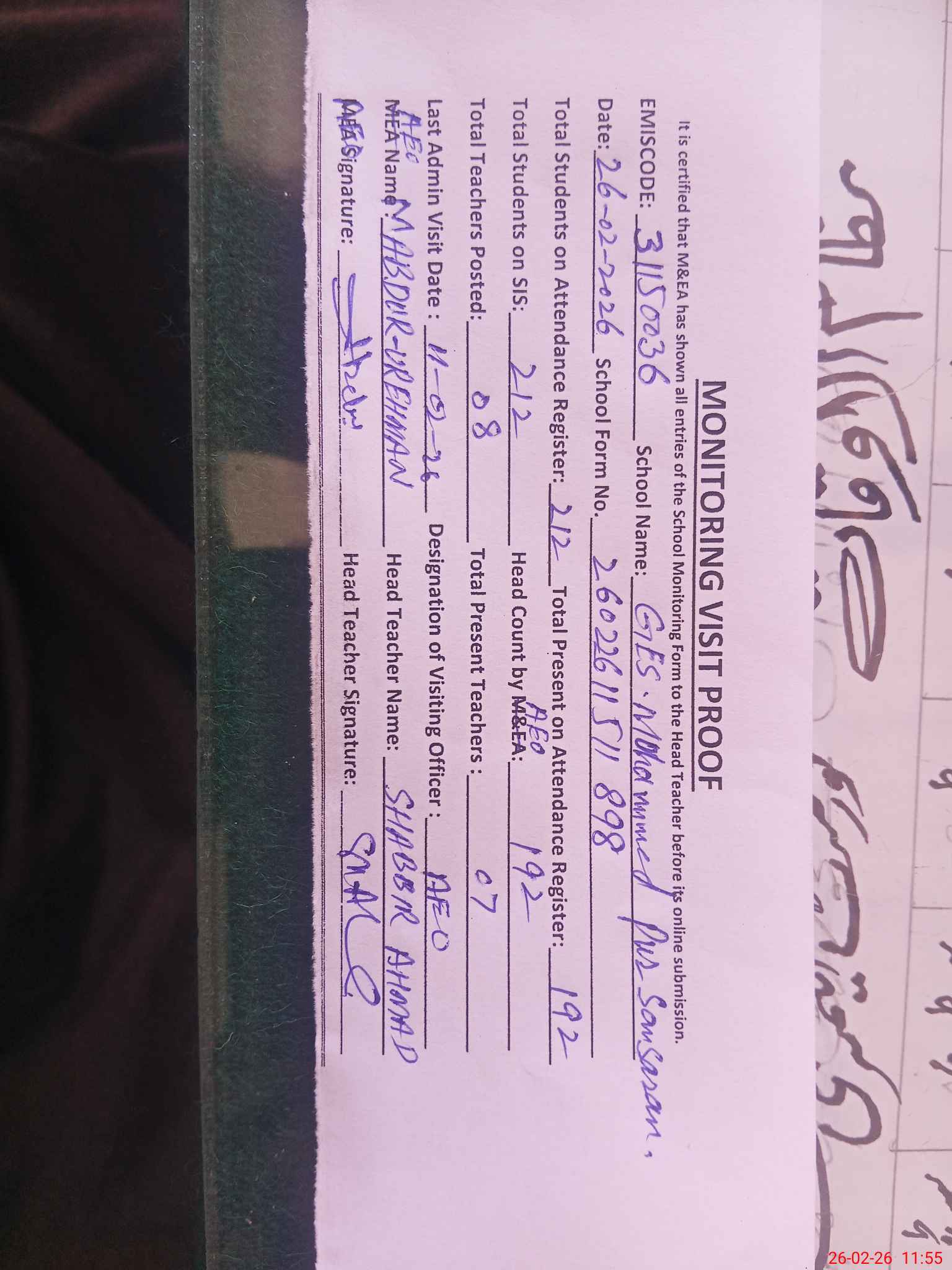 | Certified that this School was Inspected by the Undersigned MEA/DMO Today and the Information Stated Above is as Per Record. | |||||
