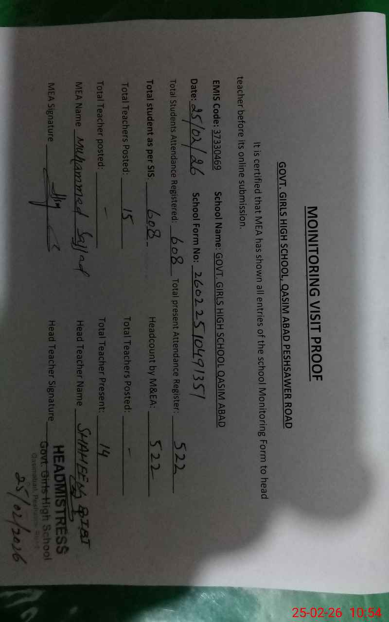 | EMIS Code: 37330469 | Name of School: GGHS QASIM ABAD KOHANOOR MILL | |||