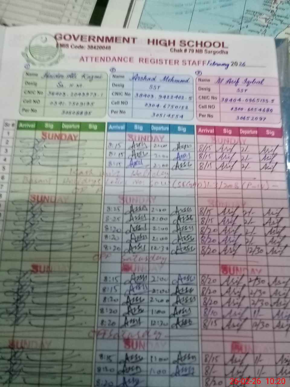 | CNIC | Full Name | Designation | R/C | Absence during last cal. month |