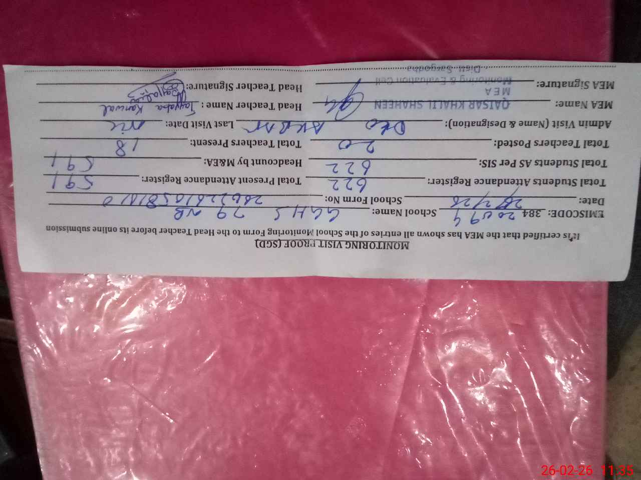 | Attendance Register | Head Teacher | MEA with School | Visit Proof |