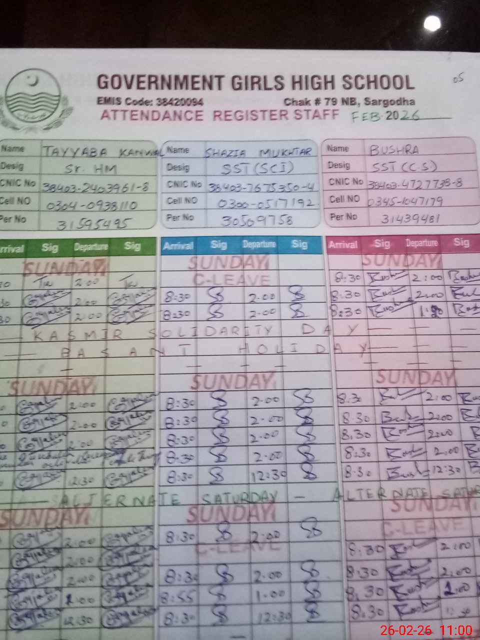 | CNIC | Full Name | Designation | R/C | Absence During Last Calender Month |
