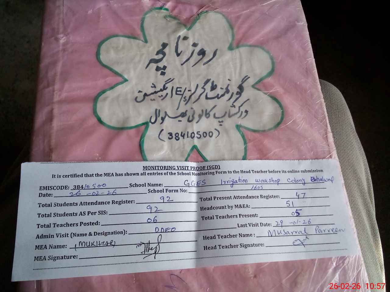 | EMIS Code: 38410500 | Name of School: GGES IRRIGATION WORKSHOP COLONY BHALWAL | |||