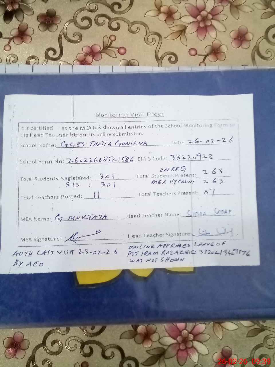 | Attendance Register | Head Teacher | MEA with School | Visit Proof |
