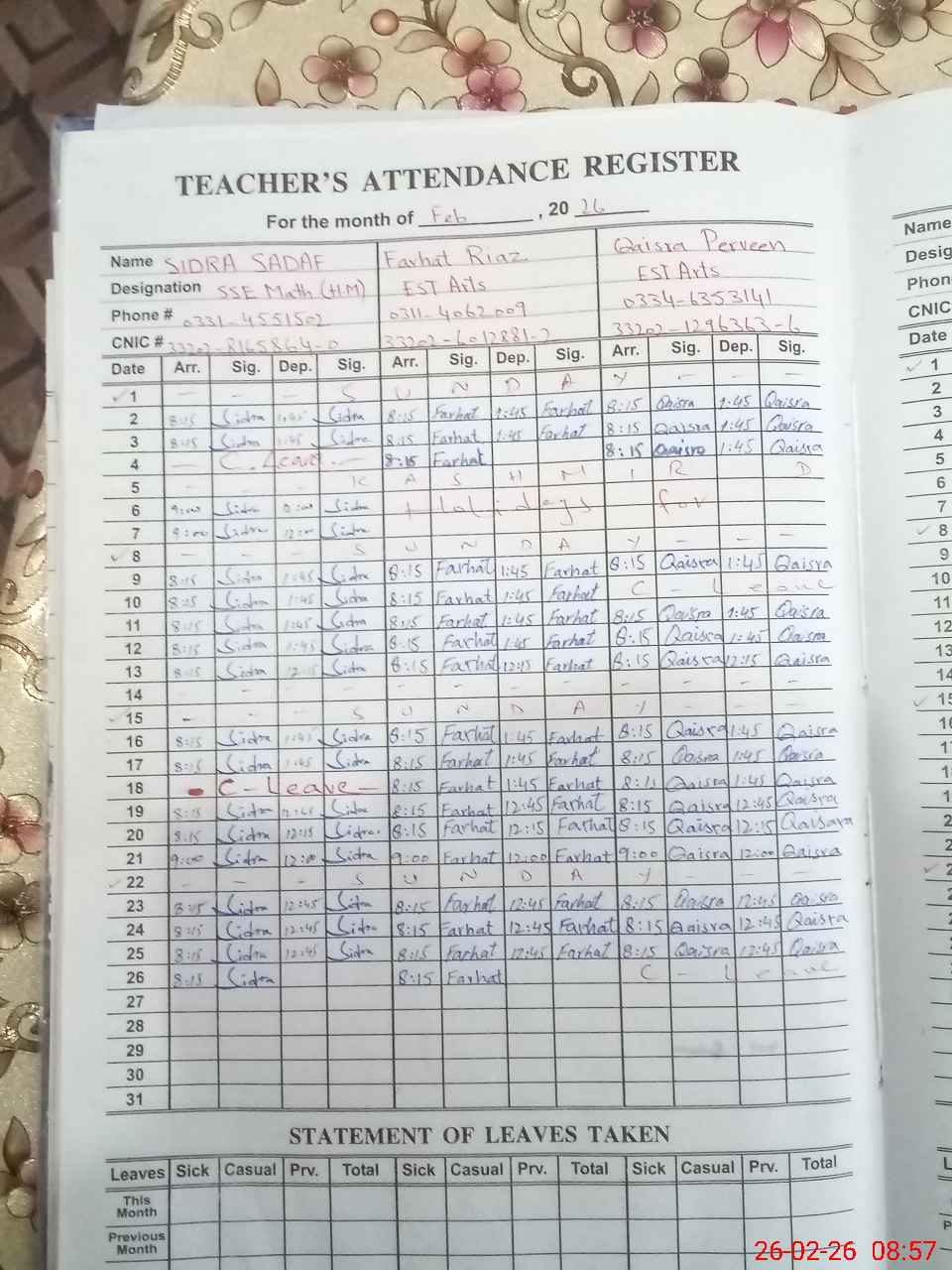 | CNIC | Full Name | Designation | R/C | Absence during last cal. month |