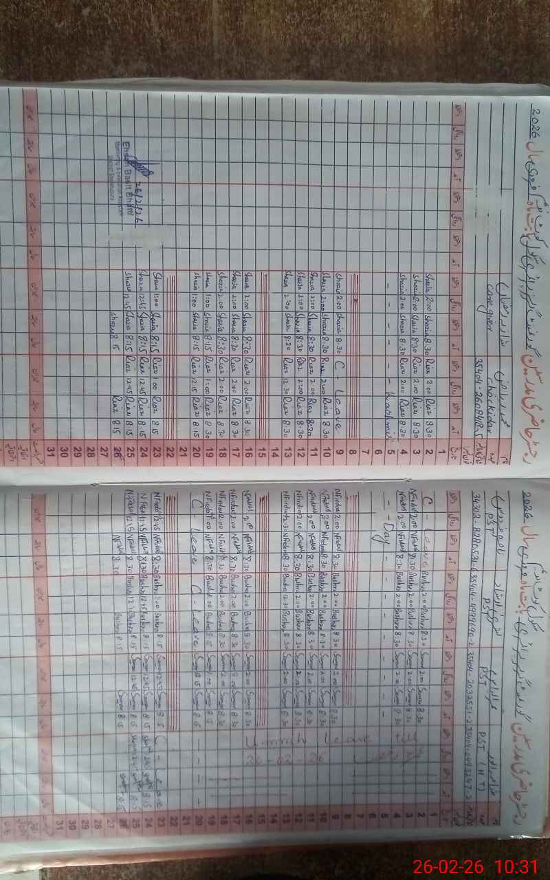 | CNIC | Full Name | Designation | R/C | Absence During Last Calender Month |