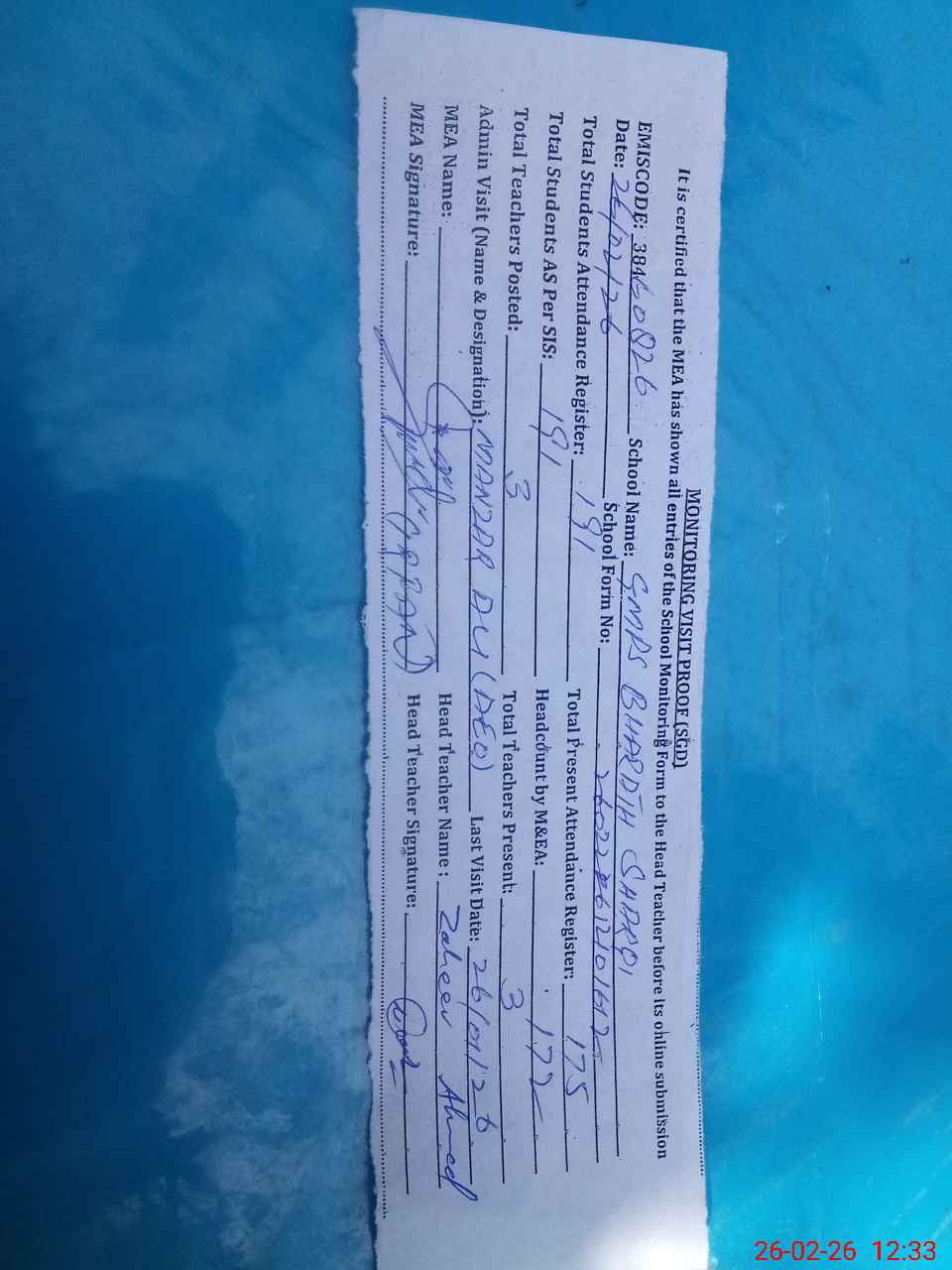 | Attendance Register | Head Teacher | MEA with School | Visit Proof |