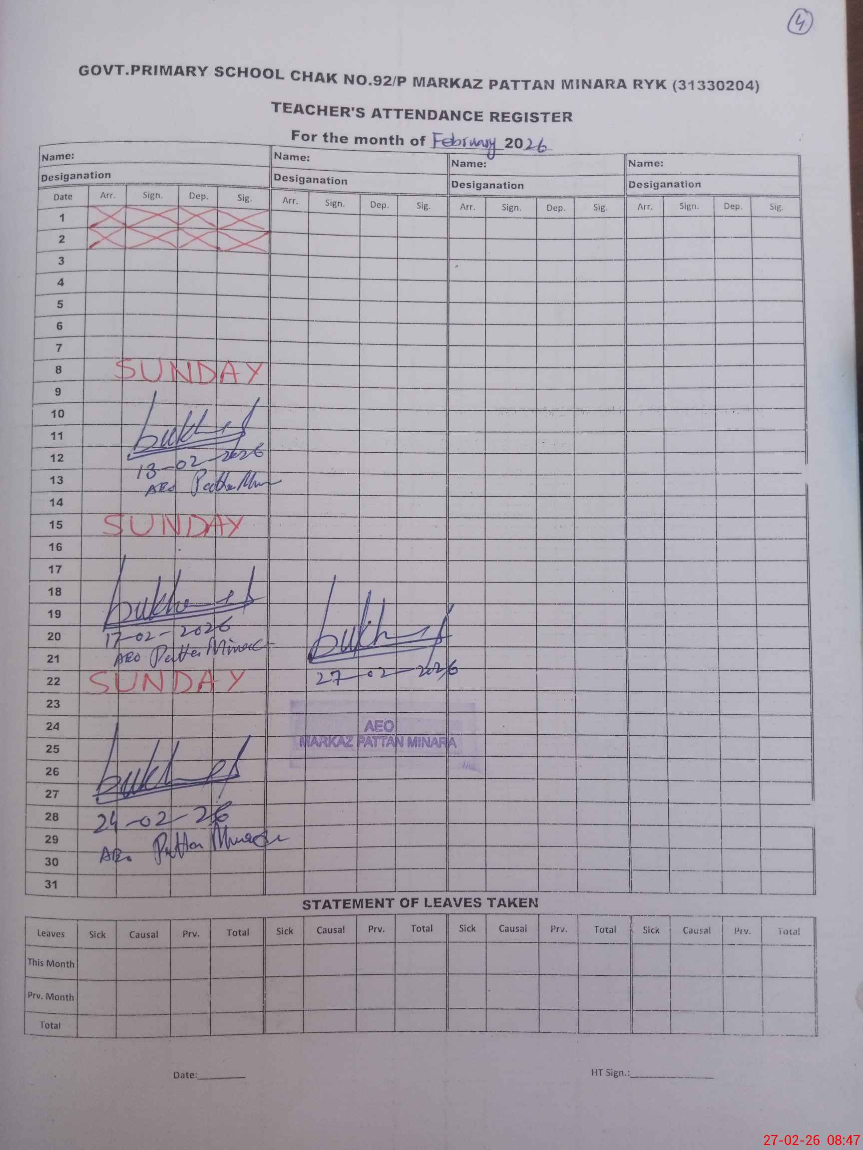 | Attendance Register | Head Teacher | MEA with School | Visit Proof |