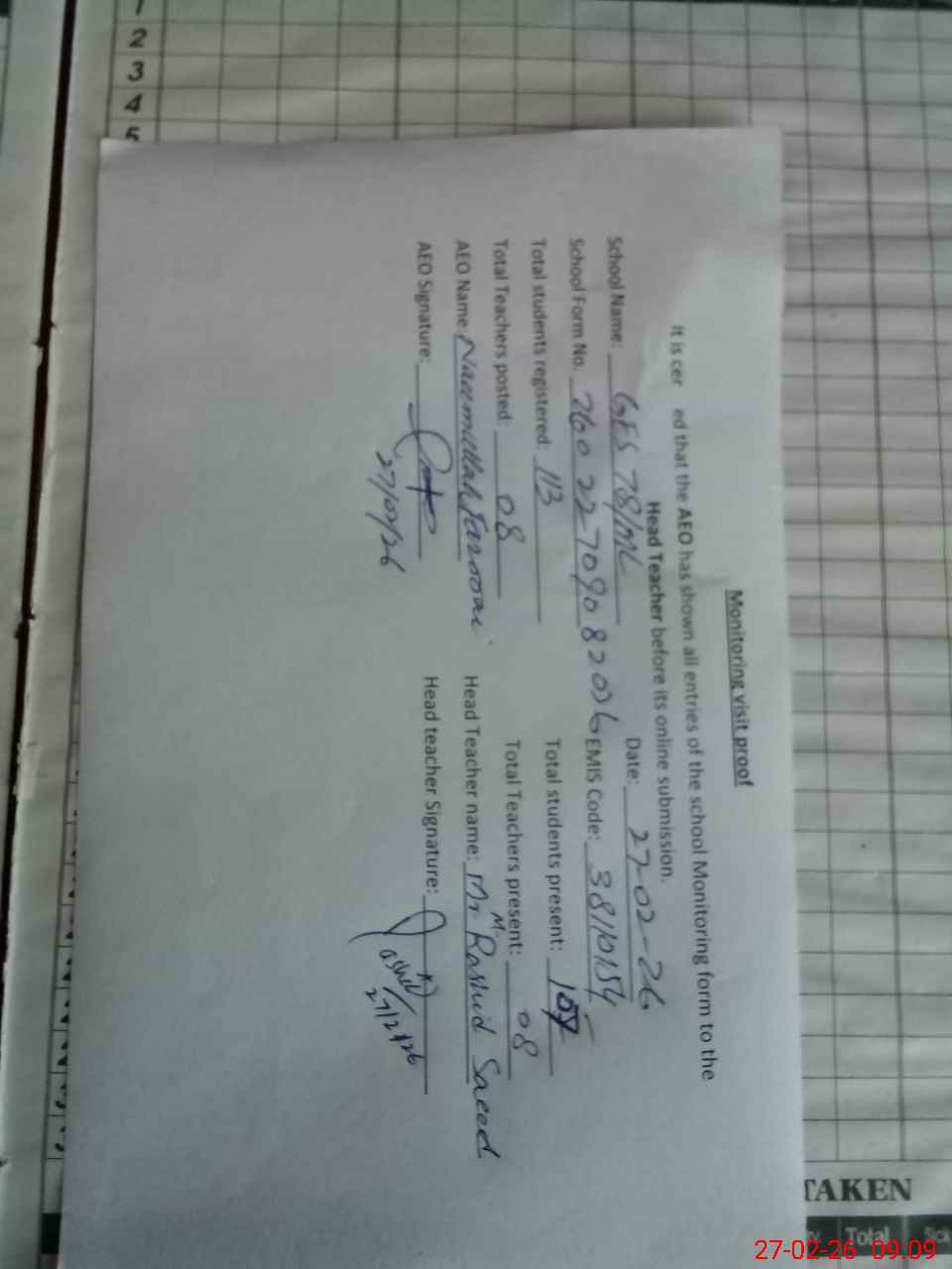 | Attendance Register | Head Teacher | MEA with School | Visit Proof |