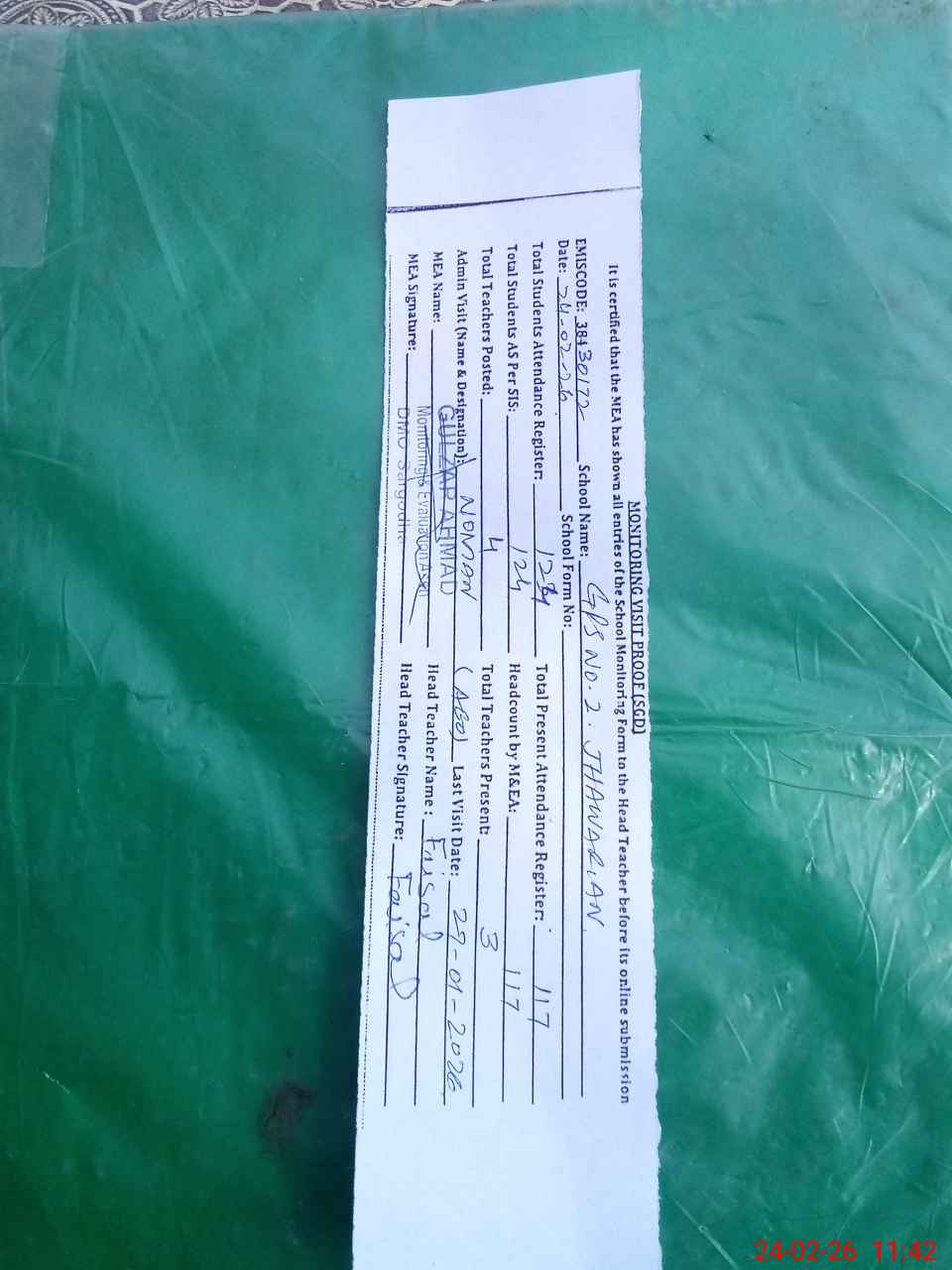 | Attendance Register | Head Teacher | MEA with School | Visit Proof |