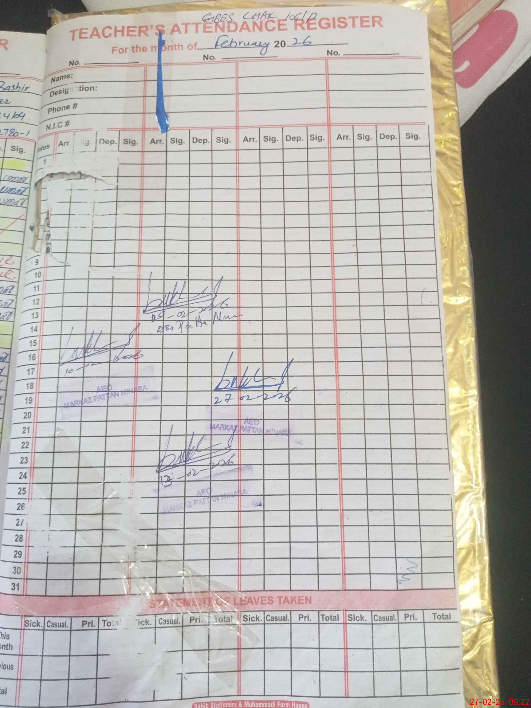 | CNIC | Full Name | Designation | R/C | Absence During Last Calender Month |