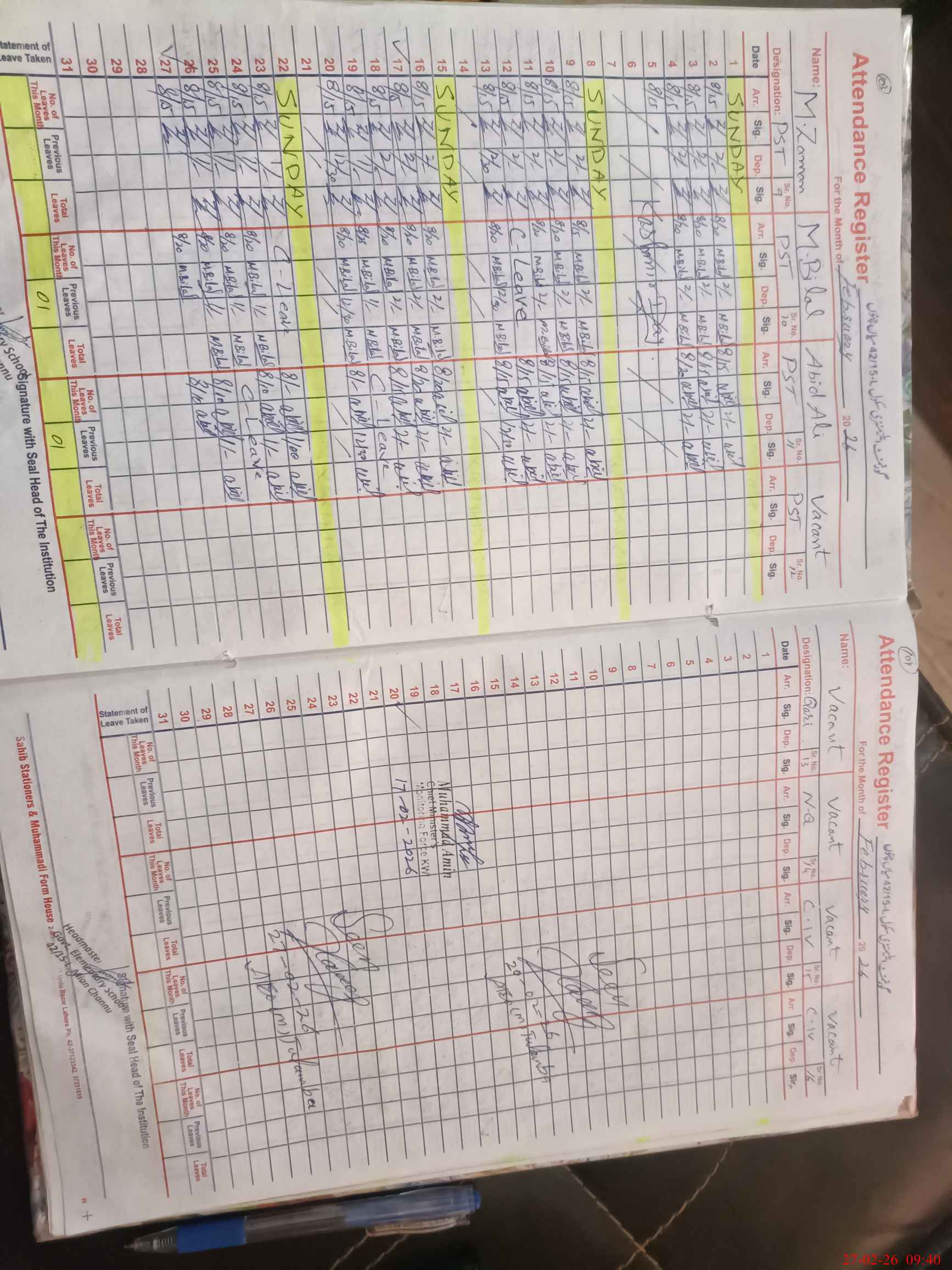 | CNIC | Full Name | Designation | R/C | Absence During Last Calender Month |