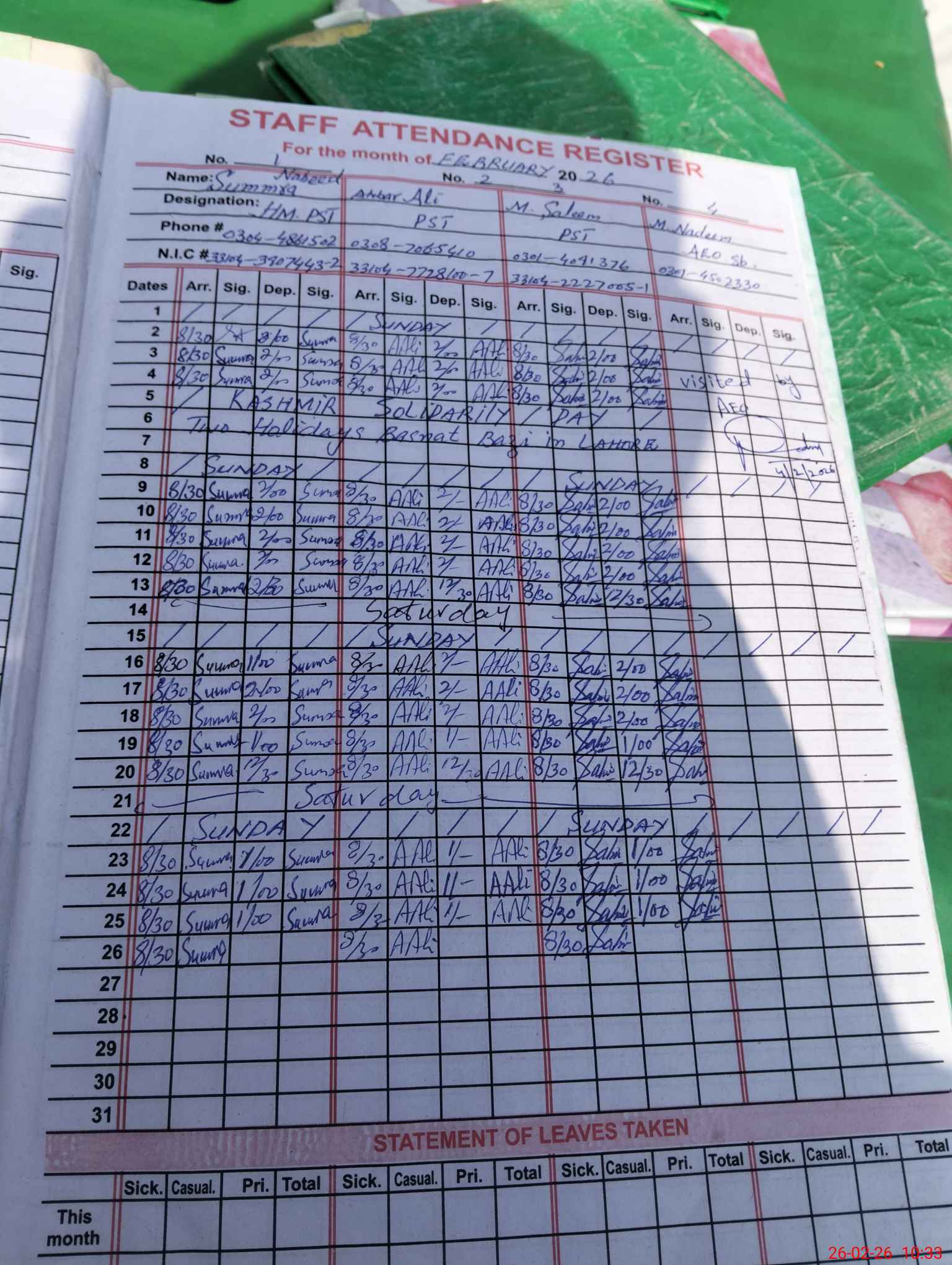 | CNIC | Full Name | Designation | R/C | Absence During Last Calender Month |