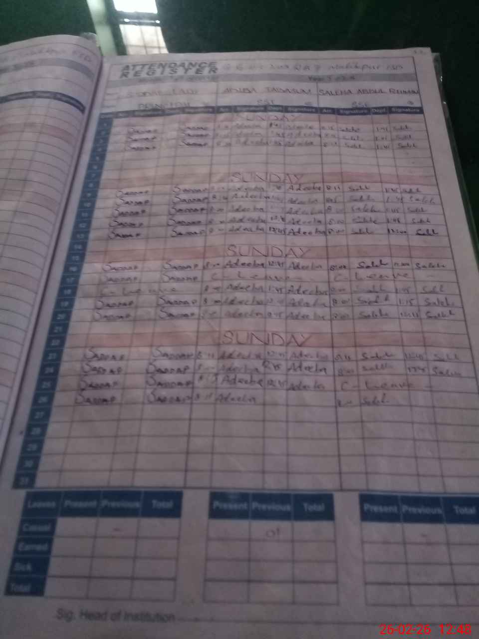 | Leave | Duty | Absent | Maternity | Medical | Ex- Pak |
