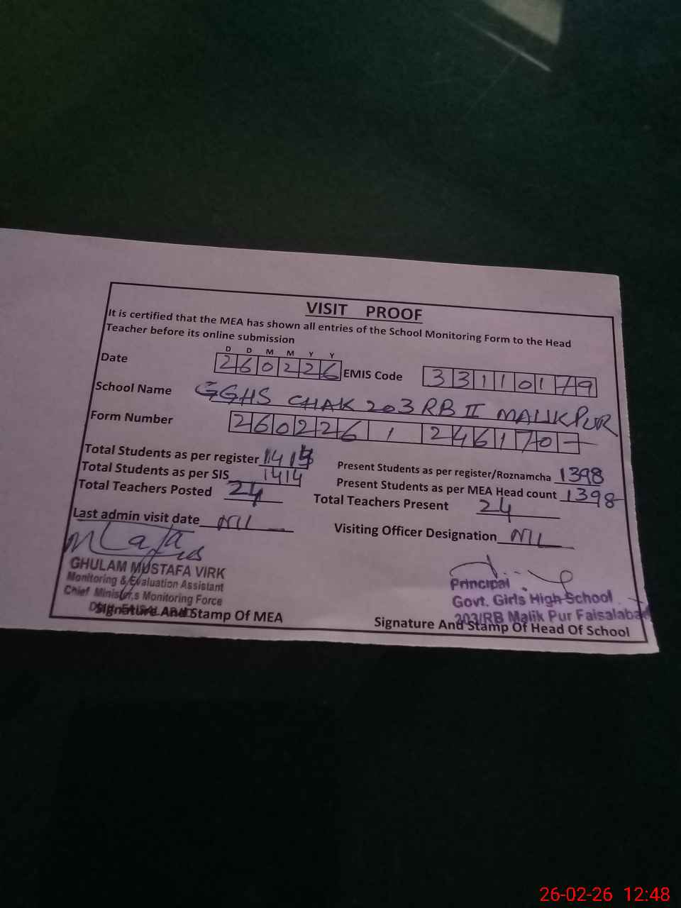 | EMIS Code: 33110179 | Name of School: GGHS CHAK 203 RB II MALIK PUR | |||