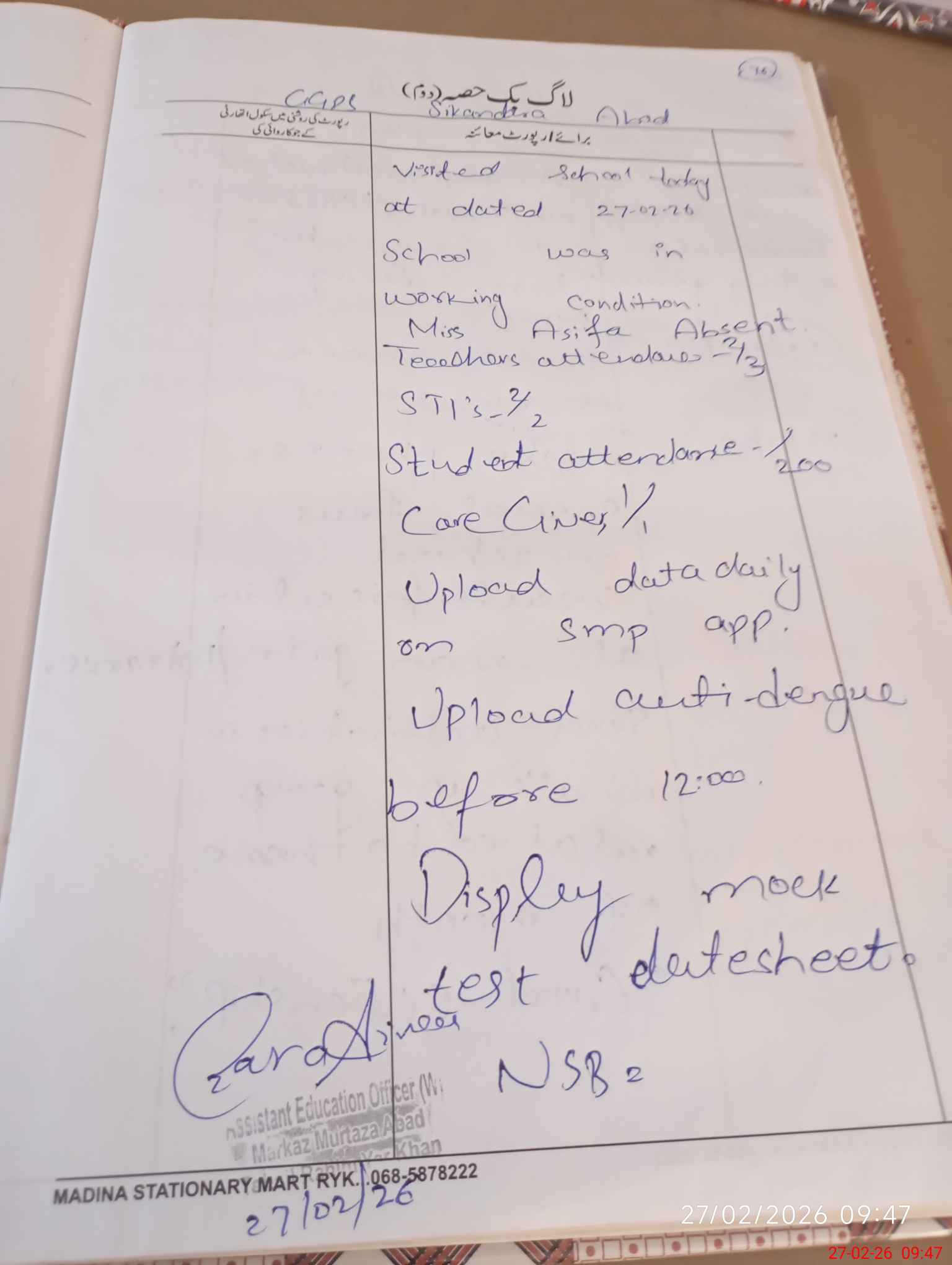 | Monitoring Date: 27-02-2026 | Start Time: 27-02-2026 09:09 AM | End Time: 27-02-2026 09:49 AM | Name of MEA: Za**** Ai**** | |