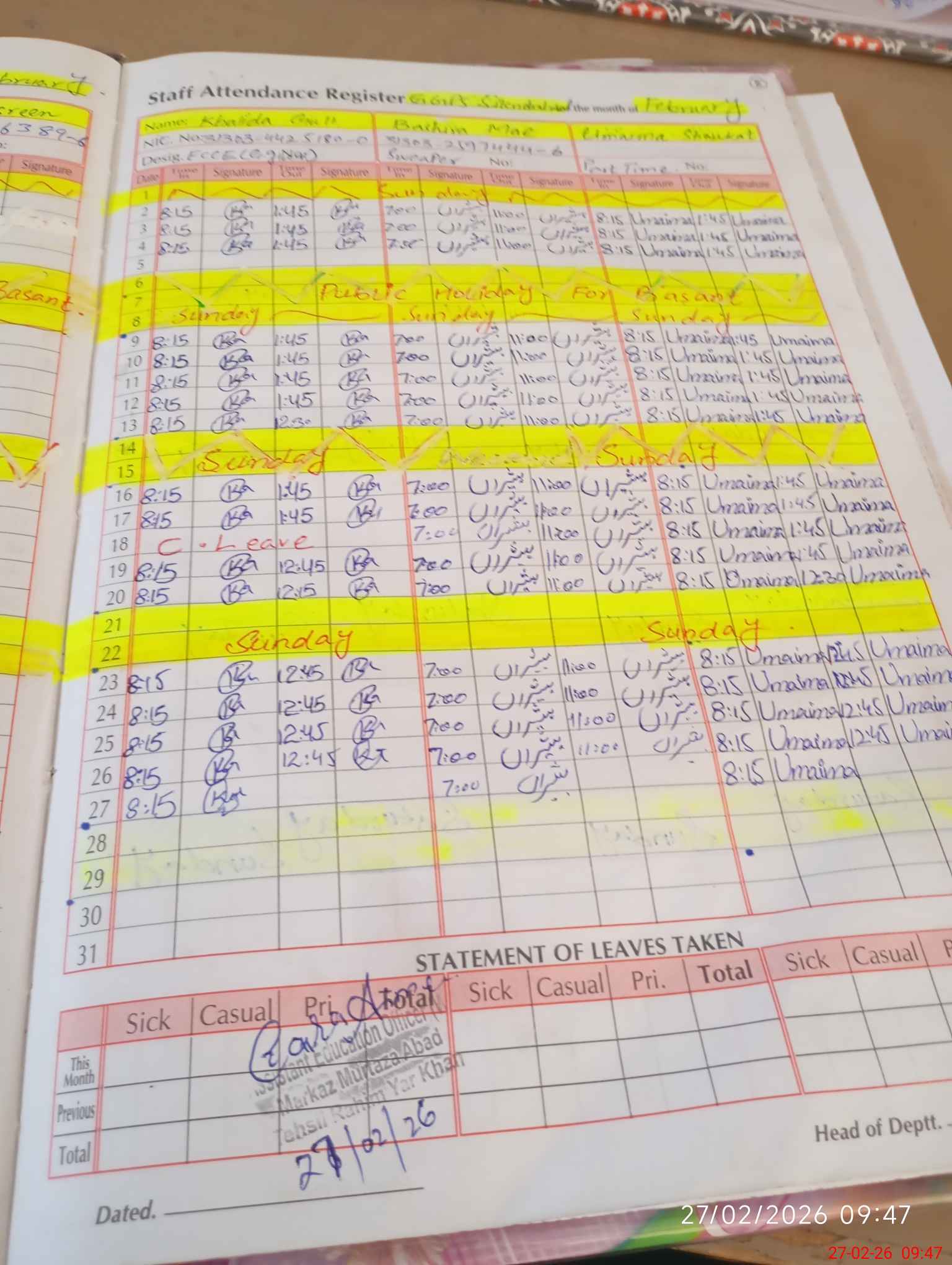 | CNIC | Full Name | Designation | R/C | Absence During Last Calender Month |