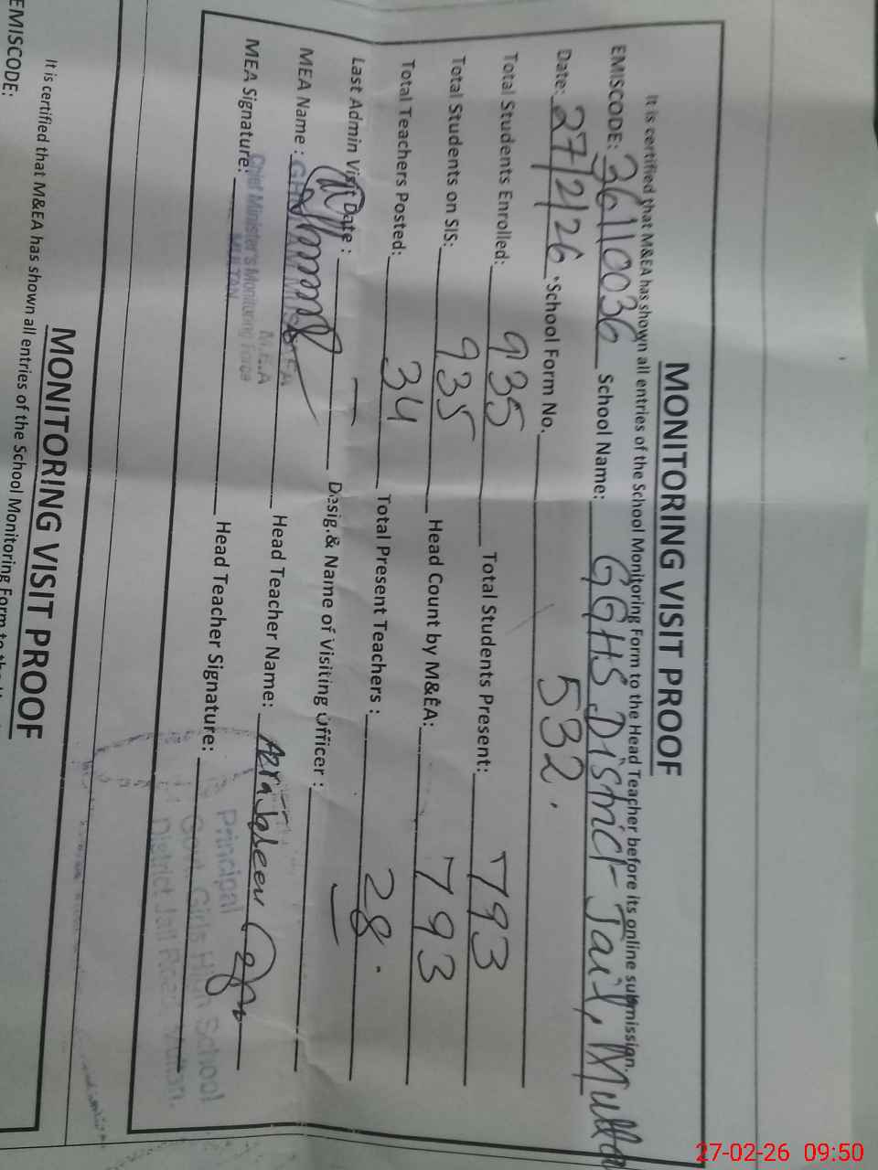| EMIS Code: 36110036 | Name of School: GGHS DISTRICT JAIL ROAD MULTAN | |||