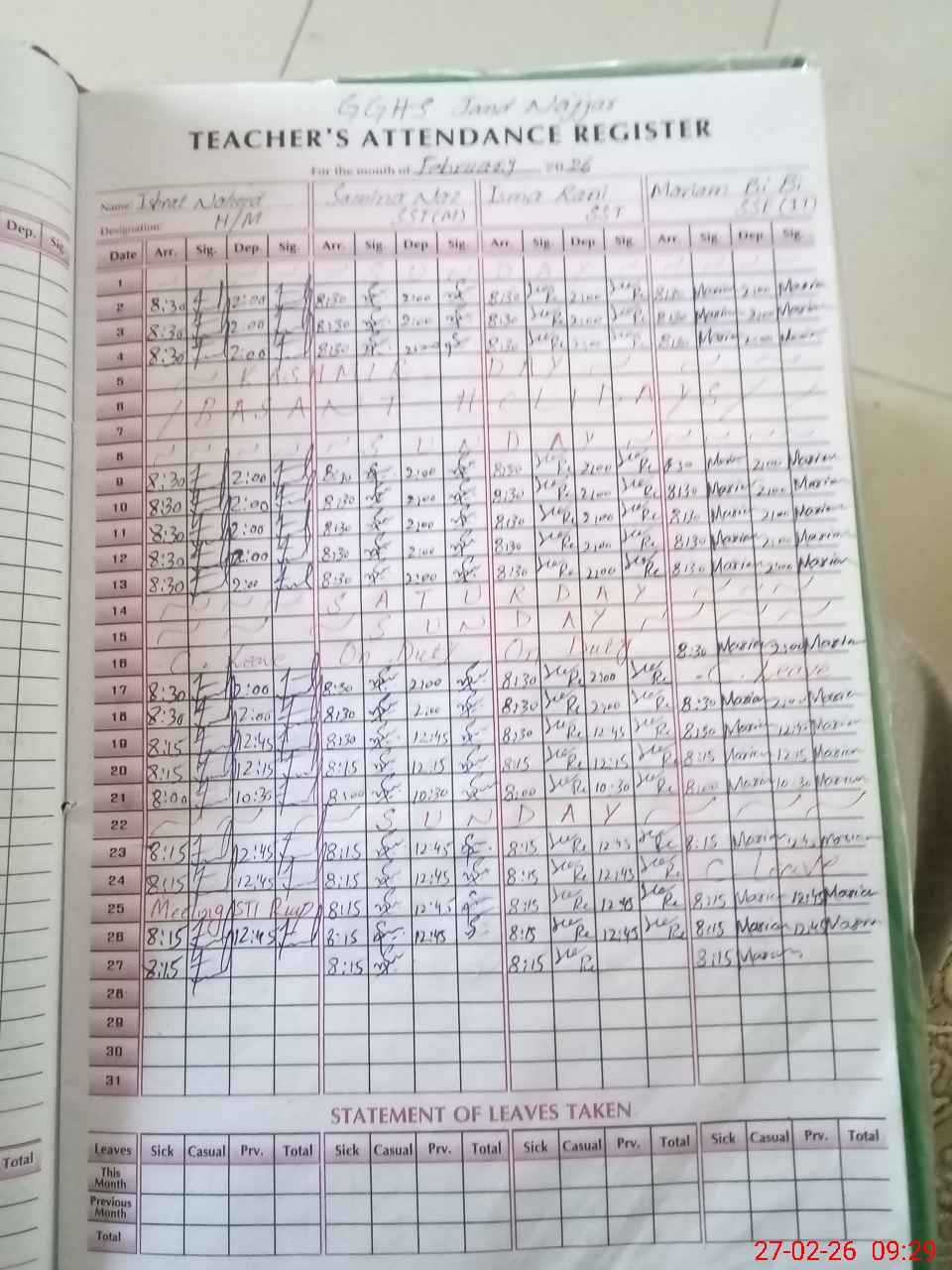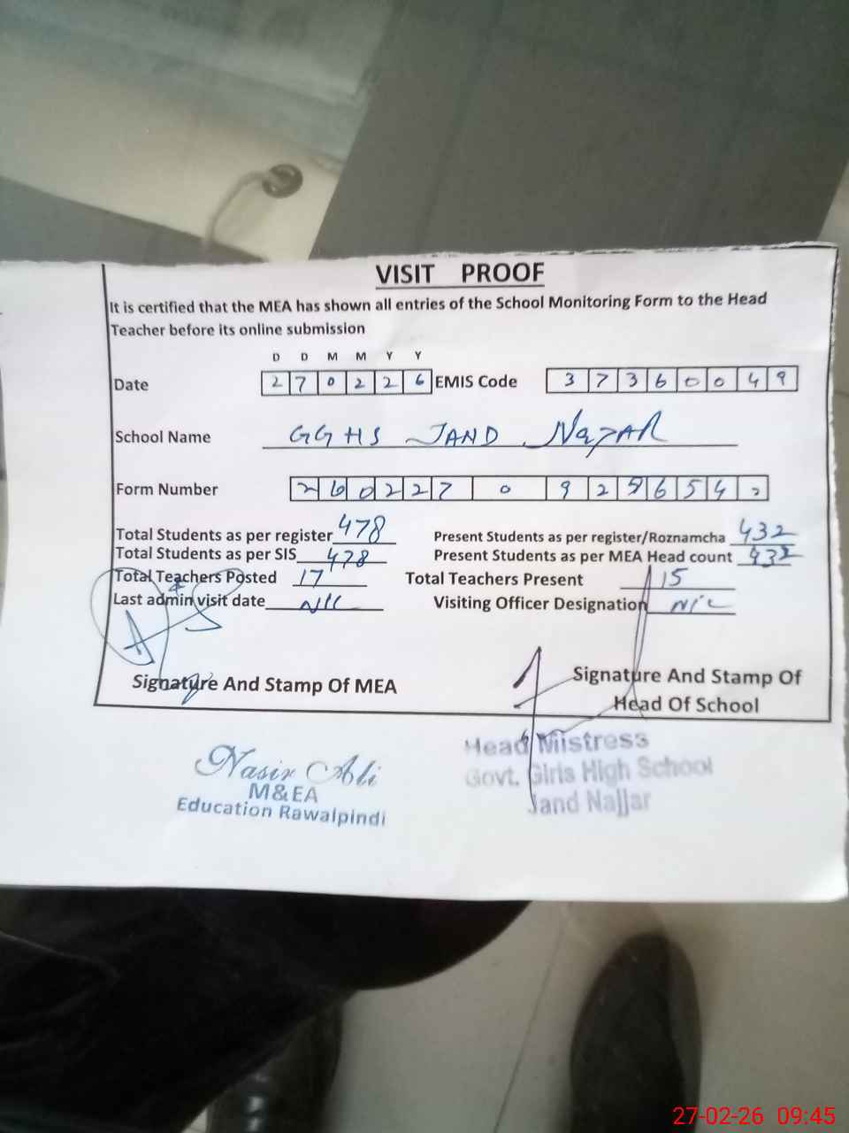 | Attendance Register | Head Teacher | MEA with School | Visit Proof |
