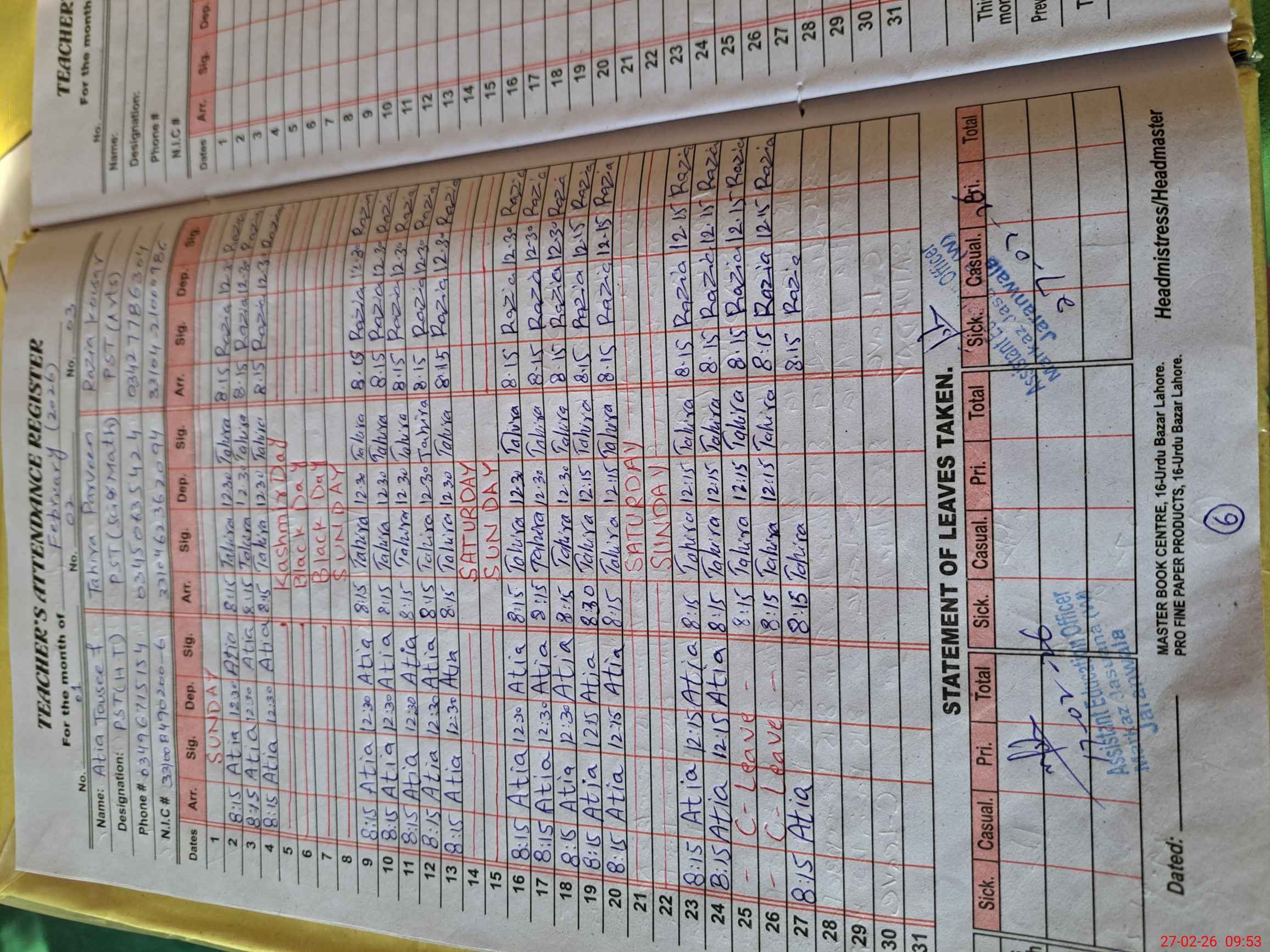| CNIC | Full Name | Designation | R/C | Absence During Last Calender Month |